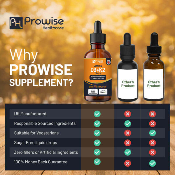 WHY BUY PROWISE Vitamin D3 And K2 Drops? - Vitamin d3 k2 drops work really well with each other. As both Vitamins are natural partners while Vitamin D helps with a boosted immune system and overall better health, added Vitamin K actually works to boost the absorption of Vitamin D in the body for better results. -